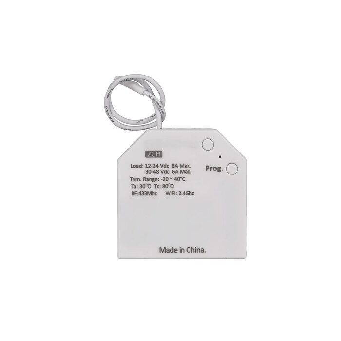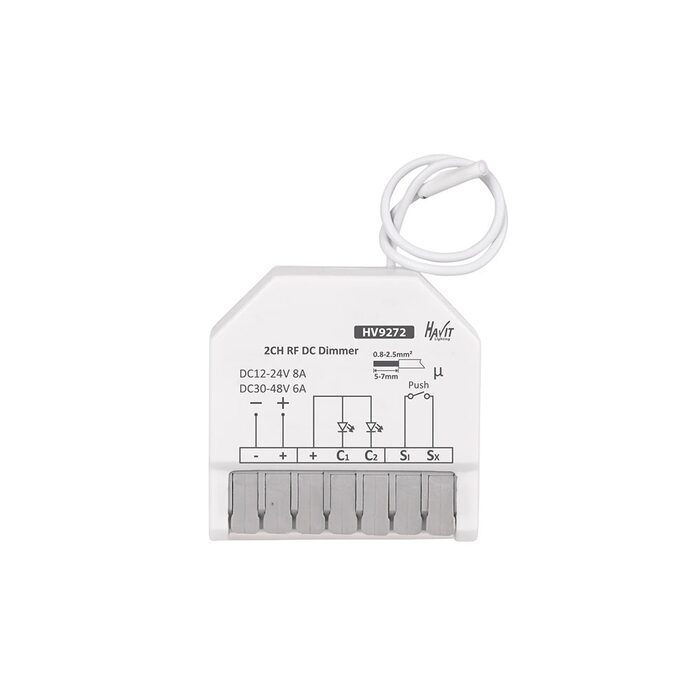 The Havit HV9272 is a 12-24v DC two-channel RF + Push Dim receiver designed to be used with wireless self-powered switches for controlling LED lighting.