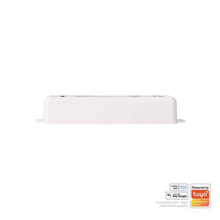 It supports control via the TUYA App and RF remotes, features a 2-channel, 4A per channel output (96W-192W), and is suitable for indoor use (IP20).