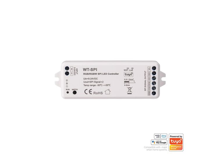 The Havit HV9105-SPI-2CH is a 12-24V DC WIFI + RF SPI LED strip receiver designed for controlling RGB SPI LED strips.