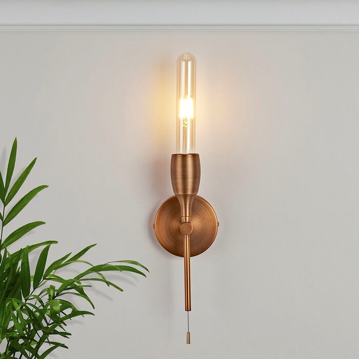 A simple LED replaceable wall light. Elegant Bronze finish. Pull cord attached at base. Pull cord can be removed at installation if preferred