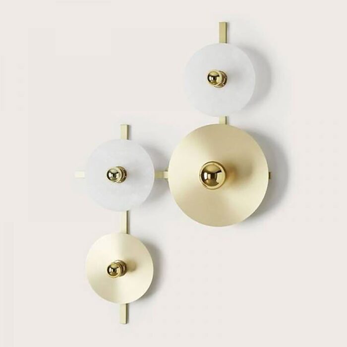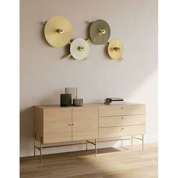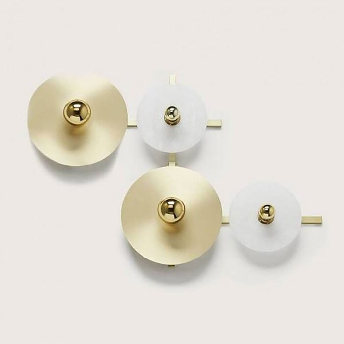 Main structure made of steel with a matte gold finish on which discs of various materials are placed.