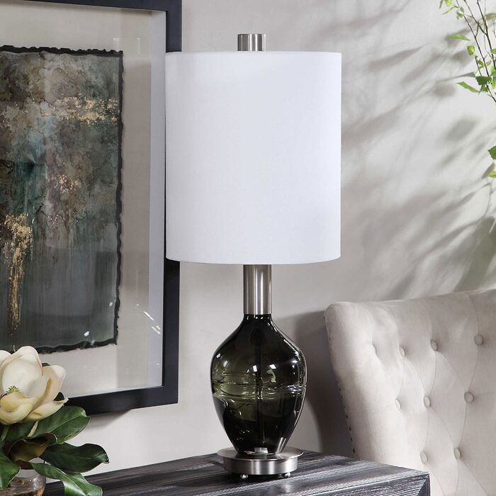 Add a pop of color to a space with this transitional buffet lamp design. The textured sage green art glass features an ombre effect that adds visual interest and is accented by brushed nickel plated details.