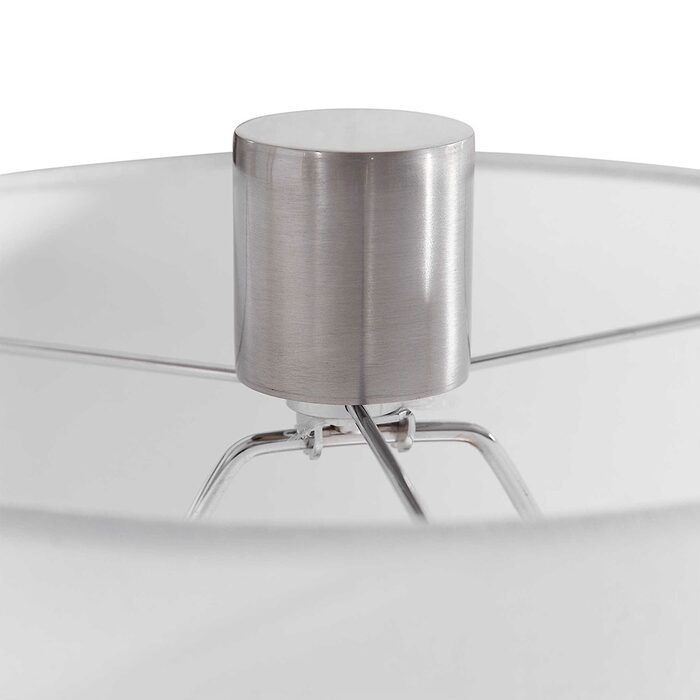 The round hardback shade is a white linen fabric.