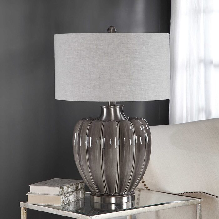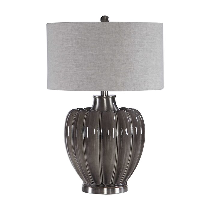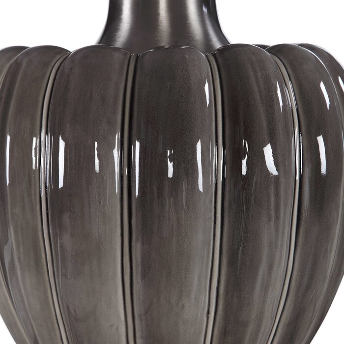 Contemporary style exudes from this elegantly shaped ceramic table lamp featuring defined ridges, finished in a smoky gray glaze, accented with brushed nickel plated details.