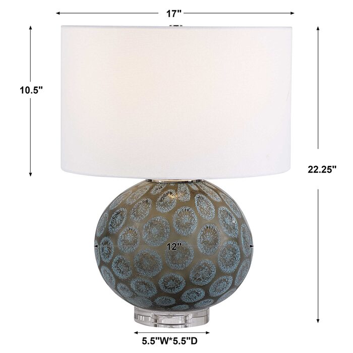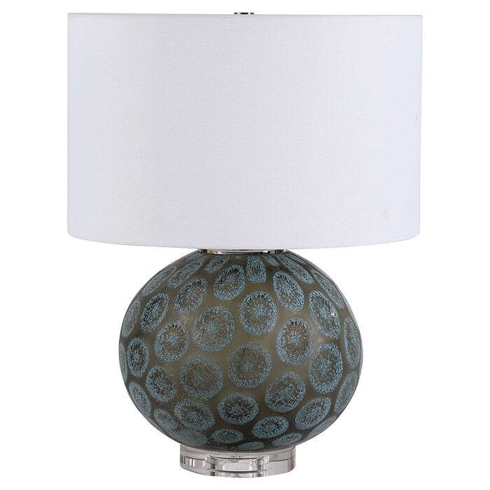 Inspired by natural agate gemstones, this table lamp features a charcoal translucent glass base with dark teal, organic shaped medallion accents, paired with polished nickel plated details and a thick crystal foot.