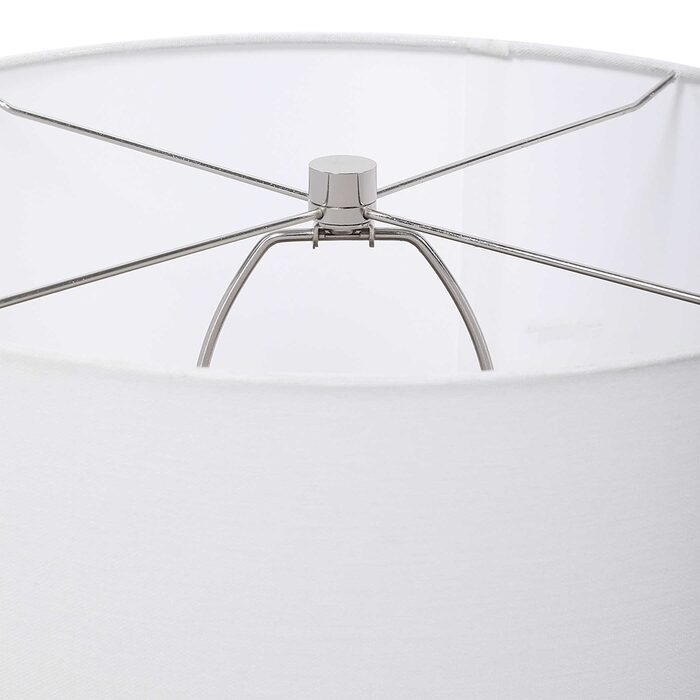 A hardback drum shade in white linen fabric completes the look.