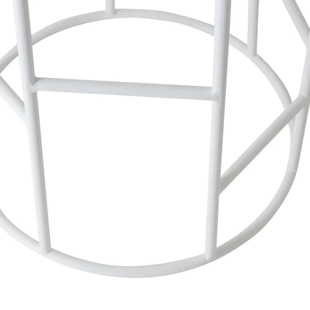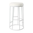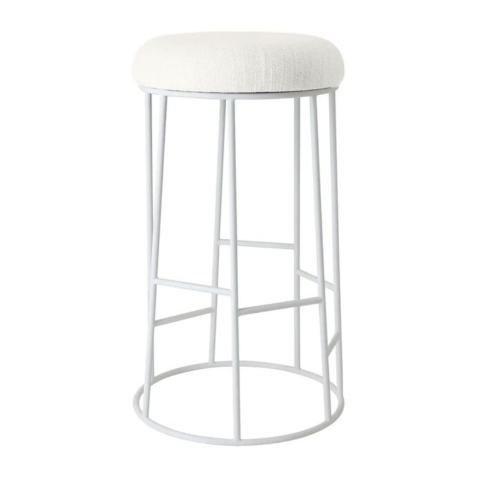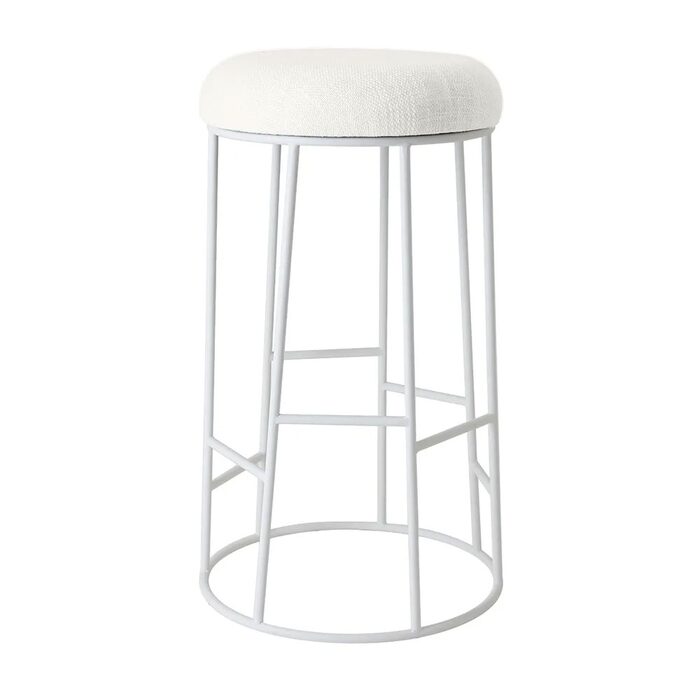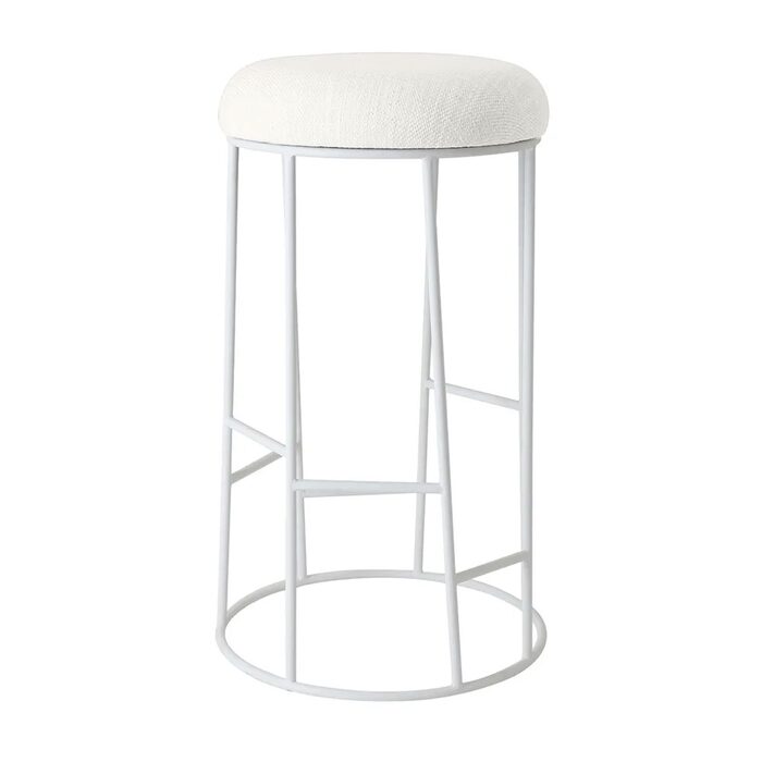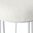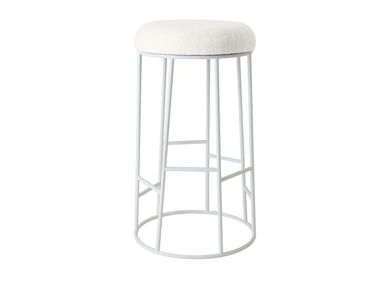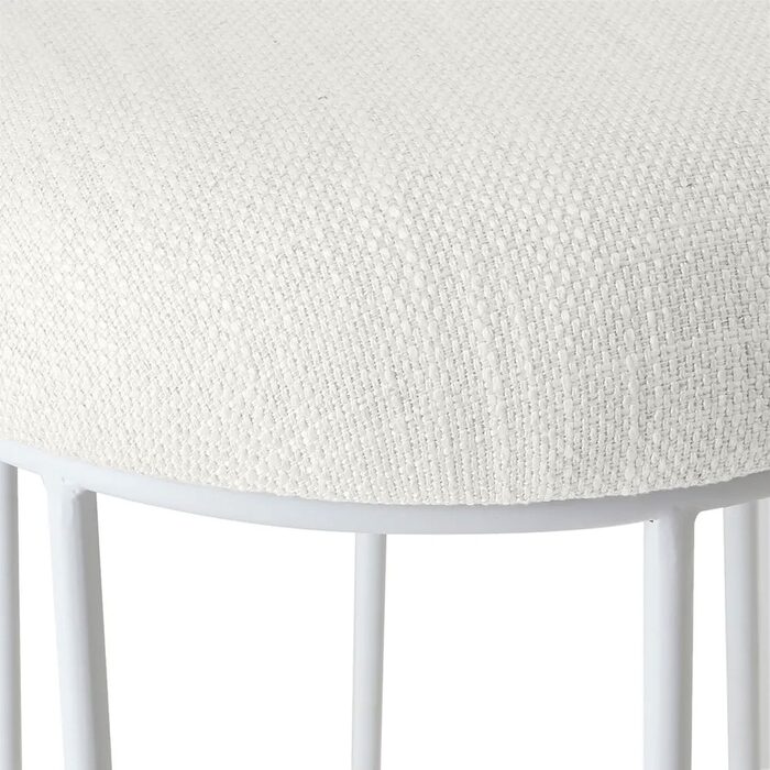 Standing 76cm high, its cushioned round seat in natural linen blend sits atop a powder-coated white steel frame with a circular base and integrated footrest for support and balance, supporting up to 150kg with no assembly required.