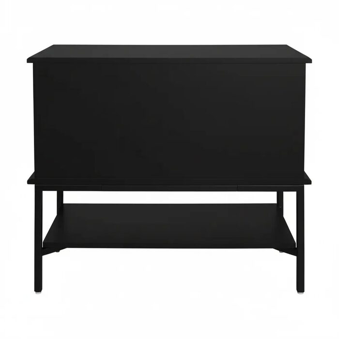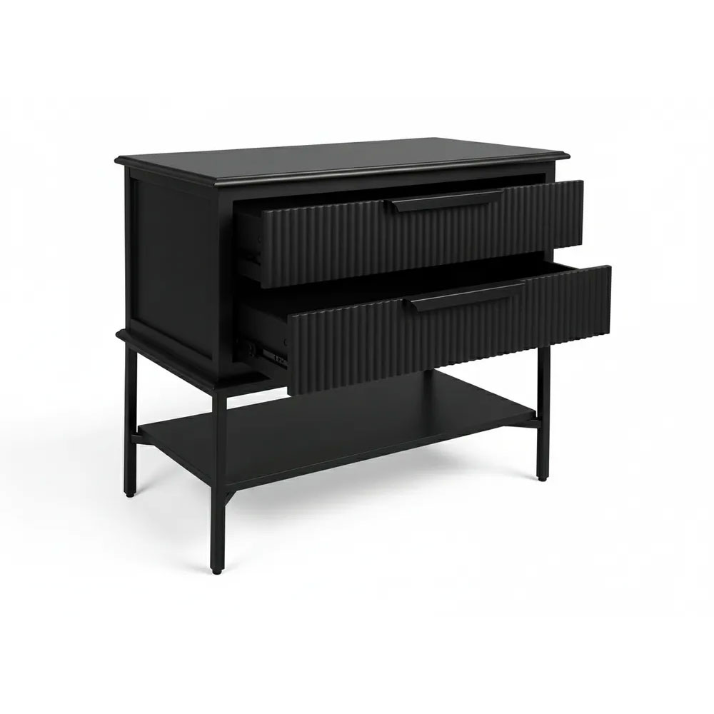 Fluted drawer fronts, streamlined handles, and a spacious open shelf deliver practical storage with sculptural appeal.