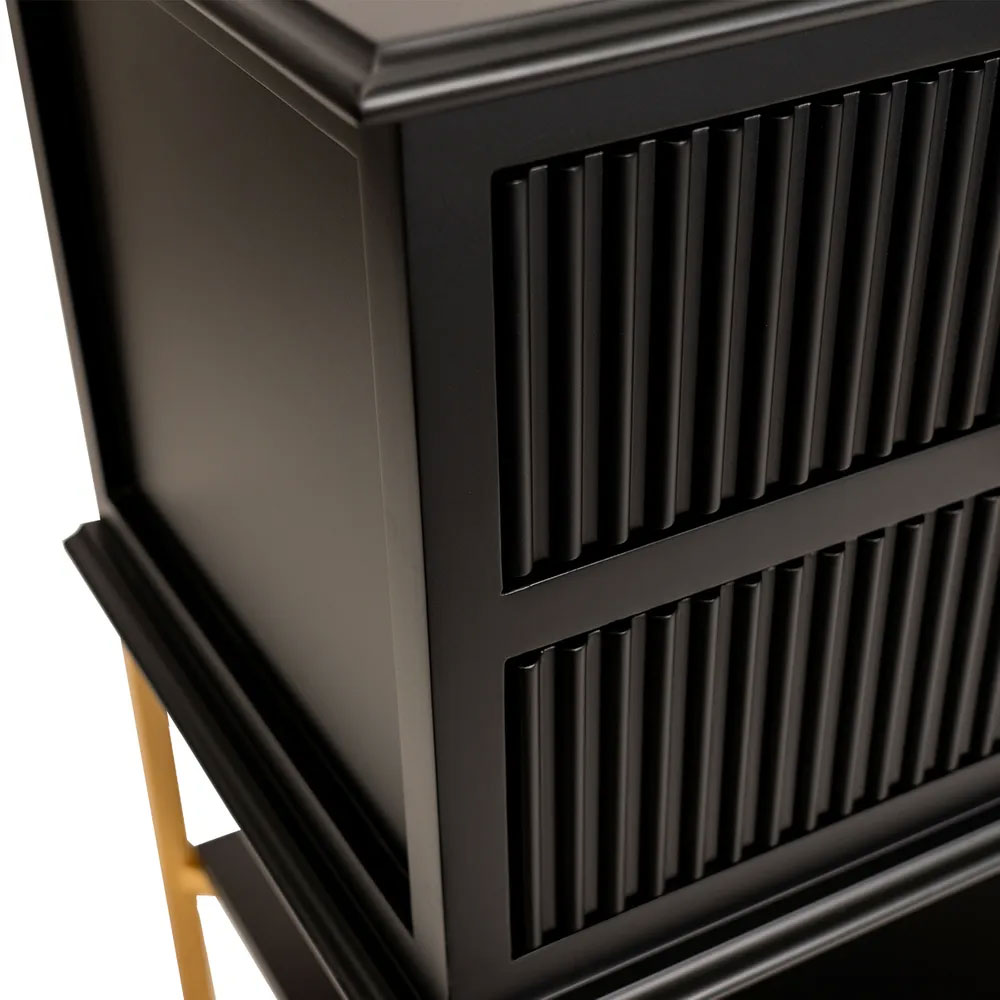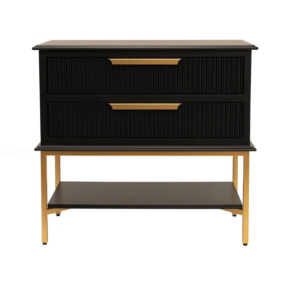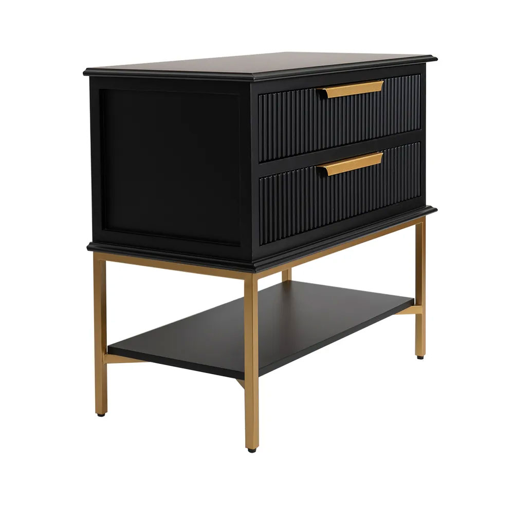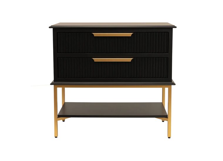 Exuding a contemporary touch with clean, modular styling and a chic satin black painted finish, the Aimee bedside table features two fluted drawers plus a bonus shelf for extra storage and display, set atop a simple and elegant gold metal frame.