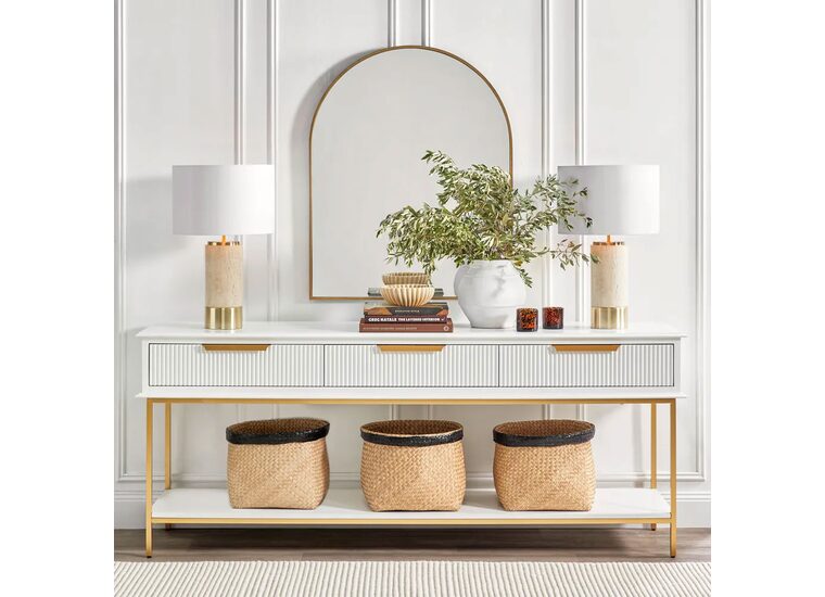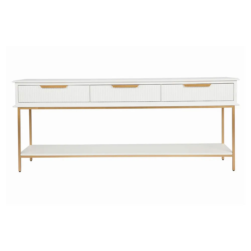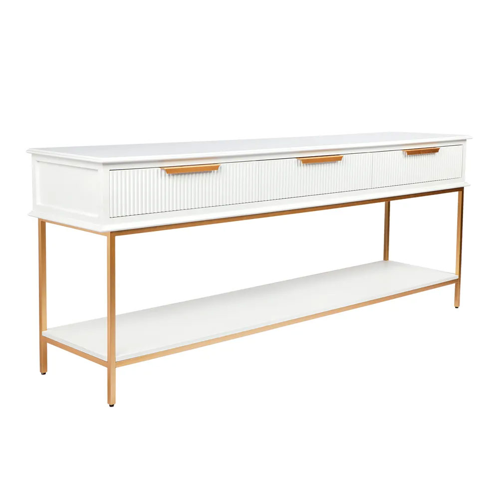 Classic contemporary in design, the large Aimee console table features three fluted drawer fronts and an elegant streamline profile in a satin white painted finish with contemporary gold metal hardware and iron frame.