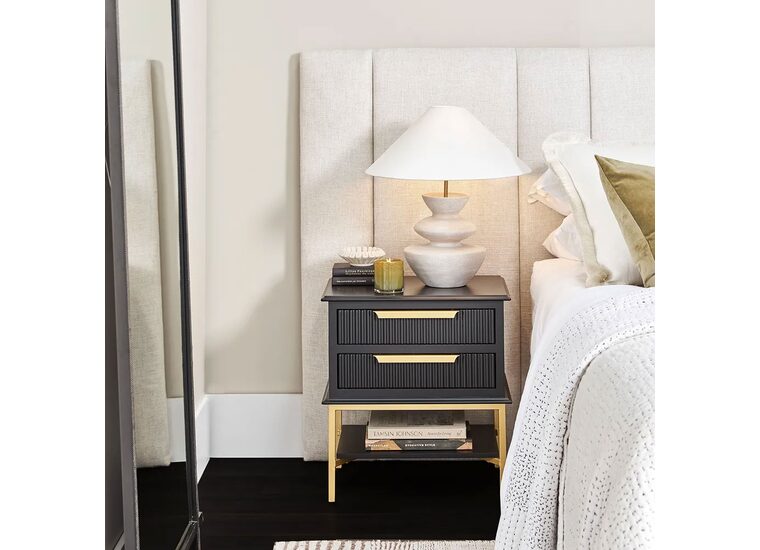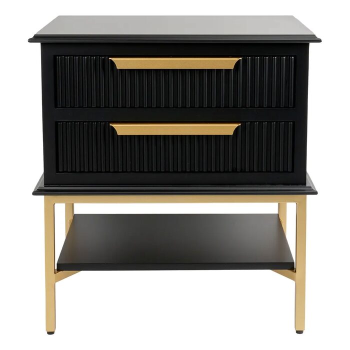 Exuding a contemporary touch with clean, modular styling and a chic satin black painted finish, the Aimee bedside table features two fluted drawers plus a bonus shelf for extra storage and display, set atop a simple and elegant gold metal frame.
