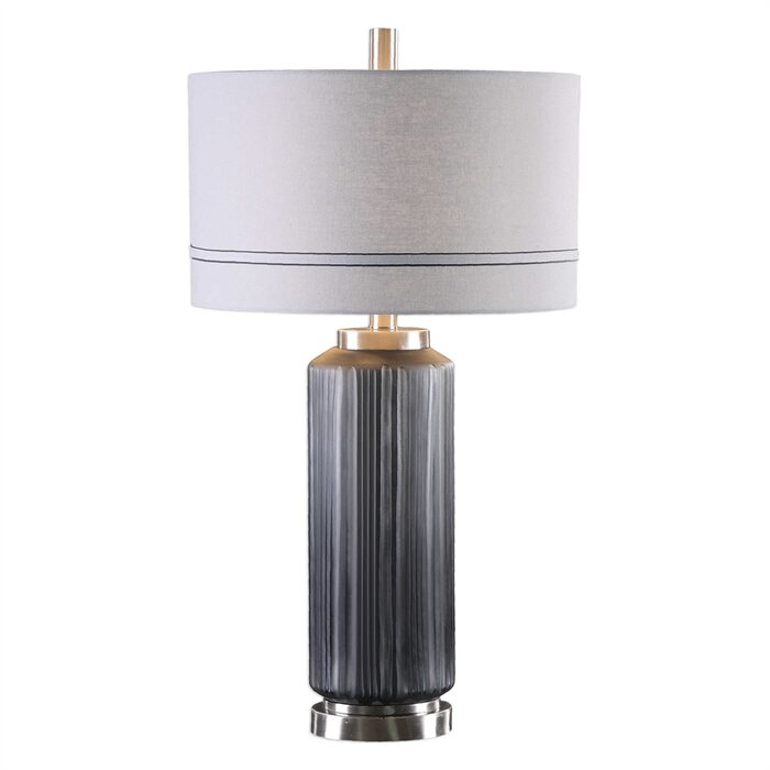 The round hardback drum shade is a light gray linen fabric with a decorative coordinating band.