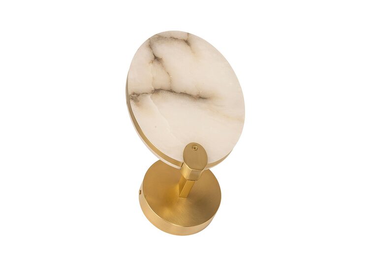 Made with exquisite metal and alabaster, it features a circular backplate with frame in gold finish holding a stunning marble effect diffuser.