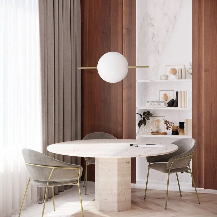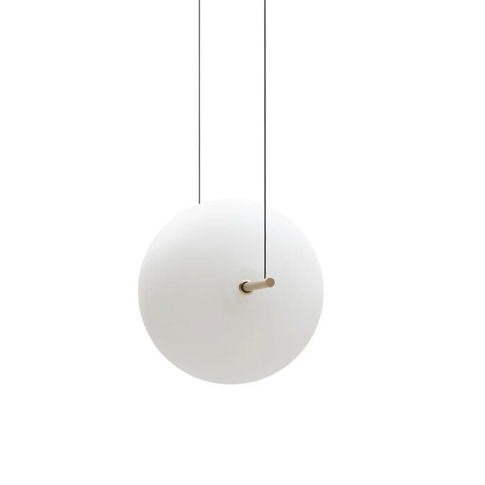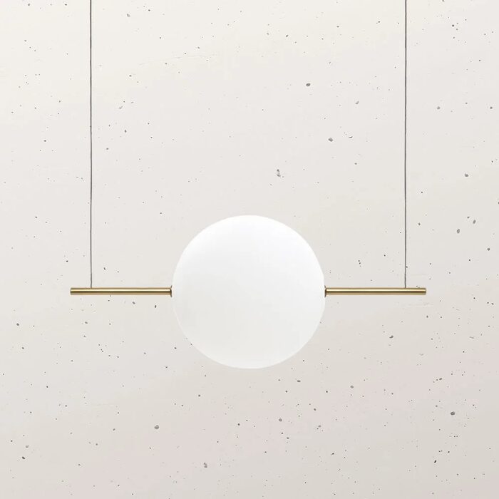 A spherical luminous body is suspended as if on a trapeze for a touch of surreal irony with an interplay of geometry and balance.