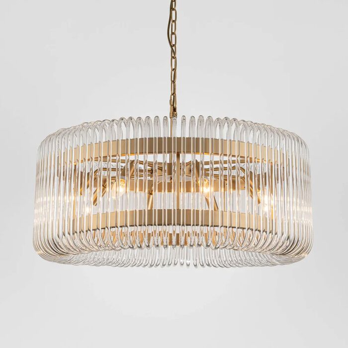 Crafted with hundreds of clear glass delicately dangling from a brass frame, the design echoes art deco glamour.