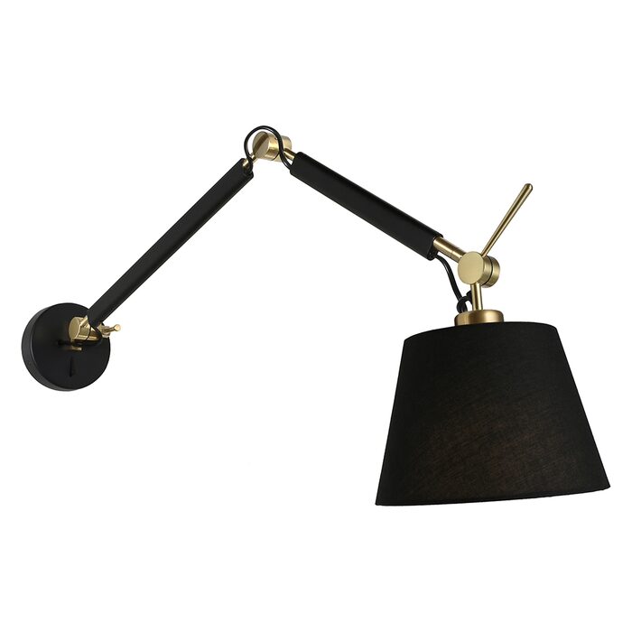 The Alsta wall light series features a circular backplate with a long pivot adjustable arm and lamp head in a black and gold finish with independent on/off switching located on the back plate.