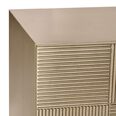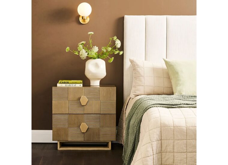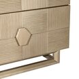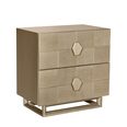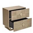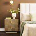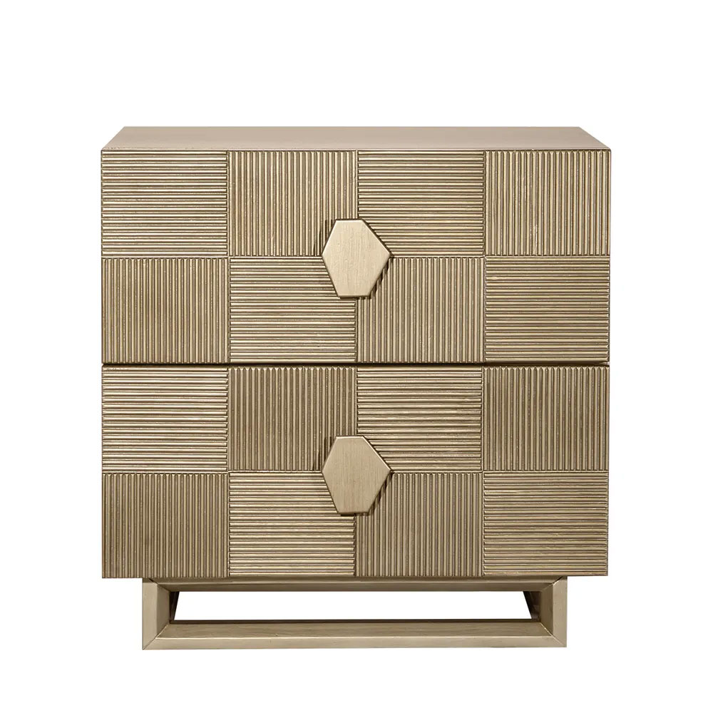 Elevate your bedroom with this stunning two-drawer bedside table, crafted with an elegant brushed gold finish and intricate geometric detailing.