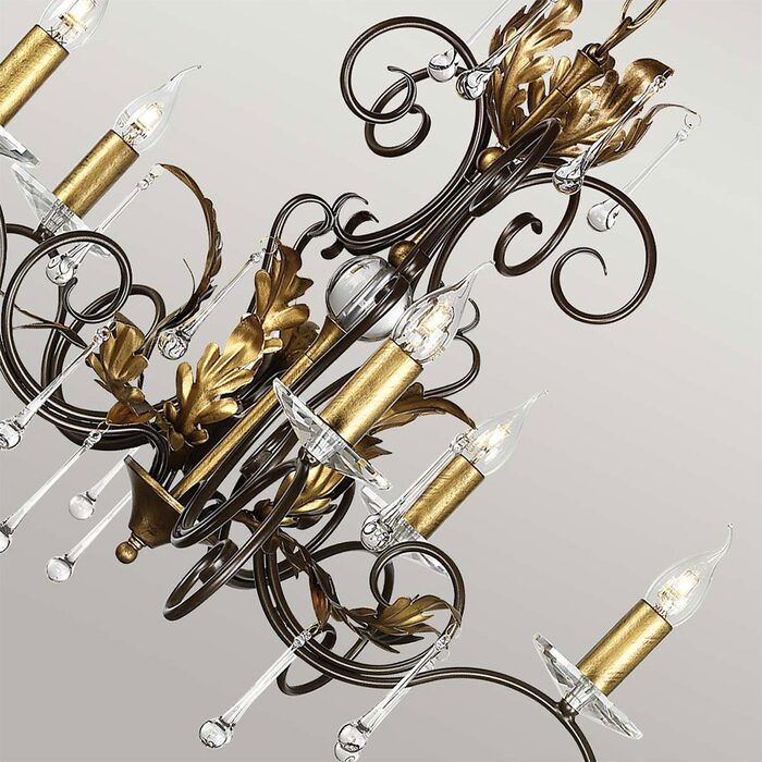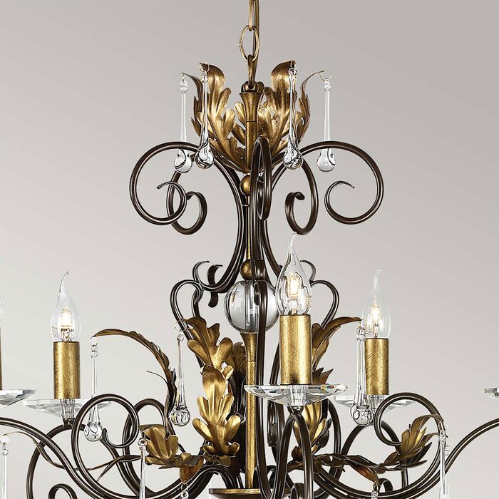 Designed and manufactured exclusively by Elstead, this handmade range features traditionally forged scrolls and antiqued oak leaves. Fittings are dressed in clear glass drops and cut glass sconces.