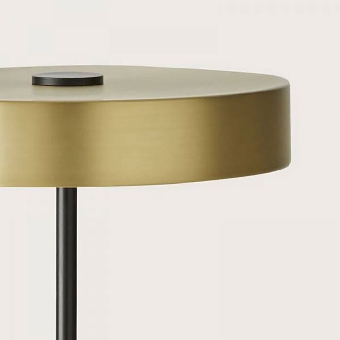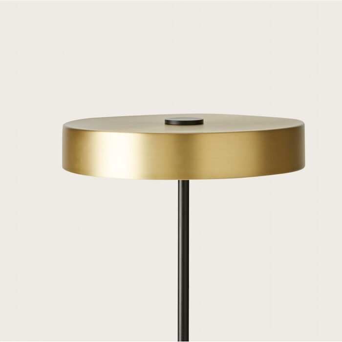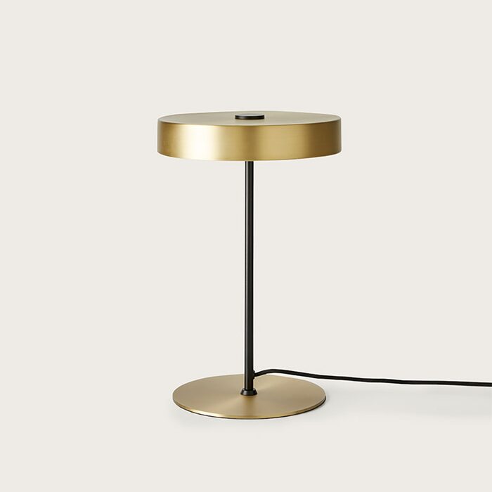 The body of the lamp is available in a matt black finish, with either a matt brass or matt black base and shade.