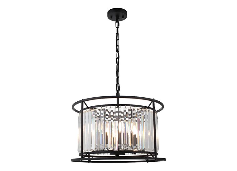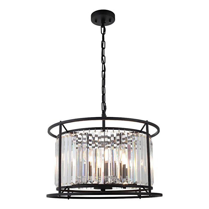 Featuring a sleek black finish and dazzling clear crystal prisms, this pendant light creates a captivating visual appeal.