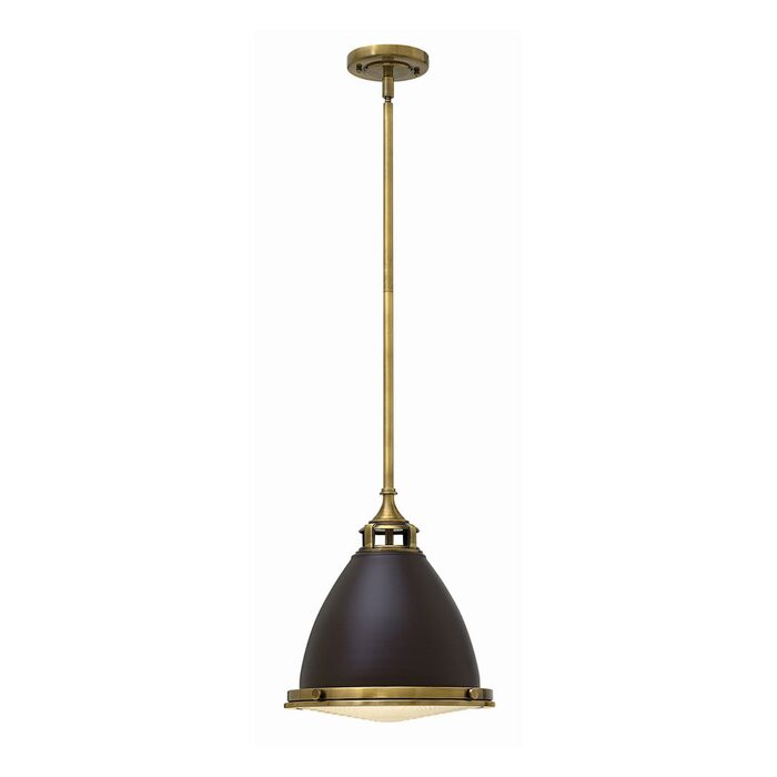 Amelia’s classic pendant design reinvents vintage details with a cast glass fitter, cast metal trim ring and prominent hinges and clasps.