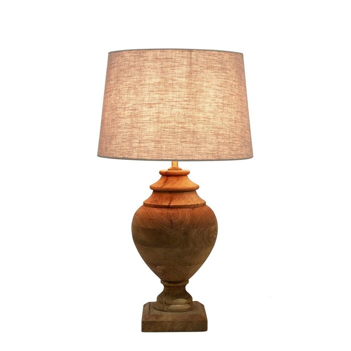 A striking banded urn shaped lamp in turned mango wood raised on a tapered square foot and finished with a round drum shade.