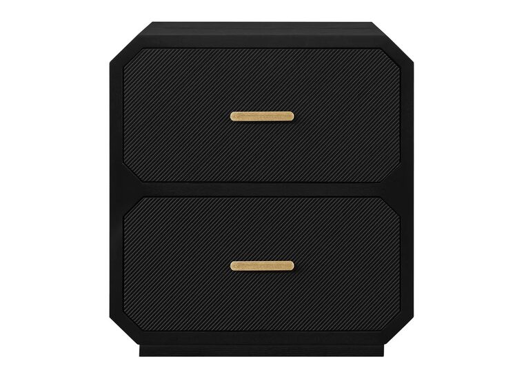 Crafted in ashwood veneer, its bold yet streamlined silhouette is enhanced by two spacious drawers featuring subtle diagonal texturing that glide seamlessly on durable metal runners.