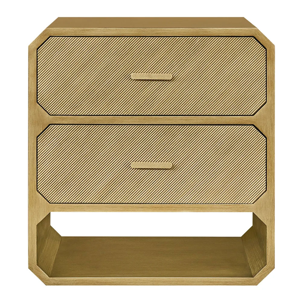 The Anderson 2 Drawer Bedside Table in Antique Gold brings luminous warmth and timeless sophistication to contemporary bedrooms.