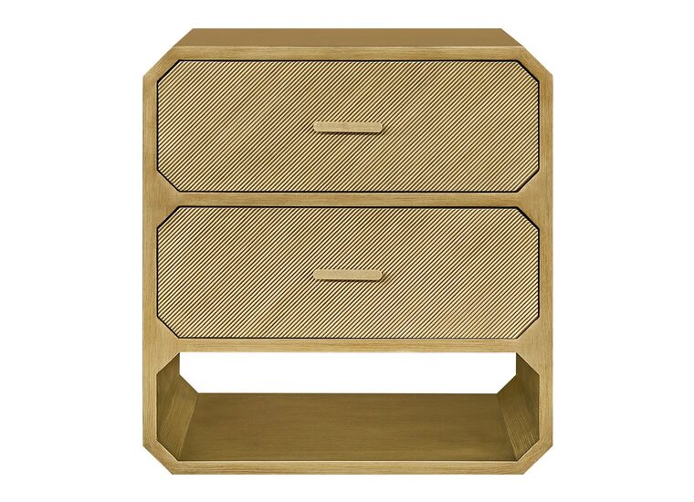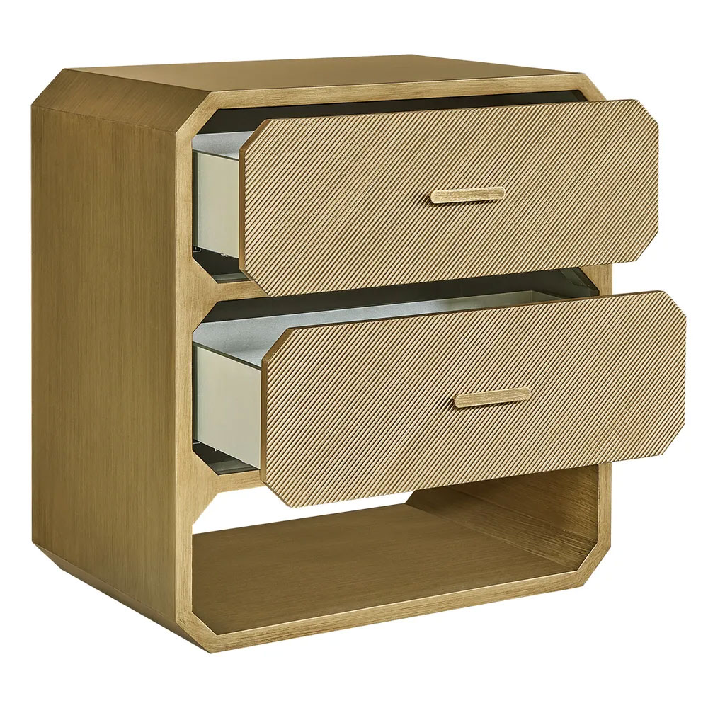 Two spacious drawers feature subtle diagonal texturing and glide smoothly on durable metal runners, complemented by sleek gold handles.