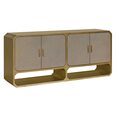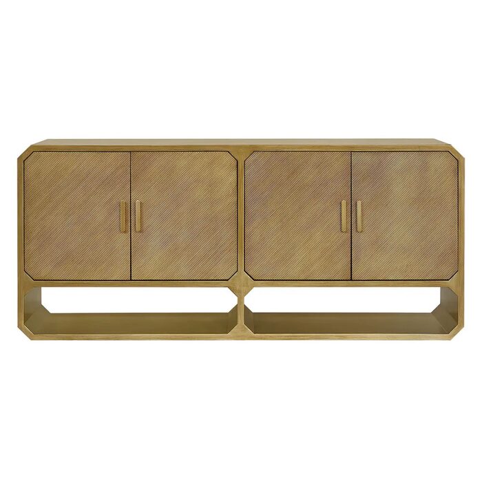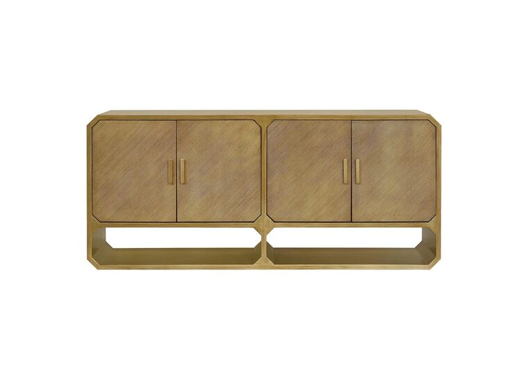 Finished in a brushed antique gold over ashwood veneer, this statement piece measures 180cm wide, 45cm deep and 80cm high, making it ideal for both storage and display.