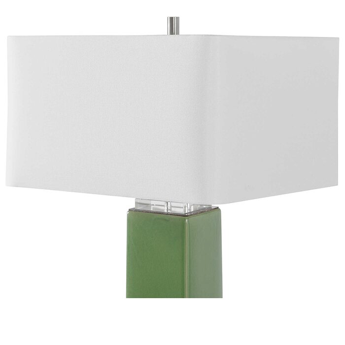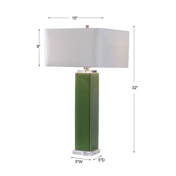 Finished in a striking tropical green glaze, this ceramic table lamp is accented by thick crystal ornaments and brushed nickel accents.