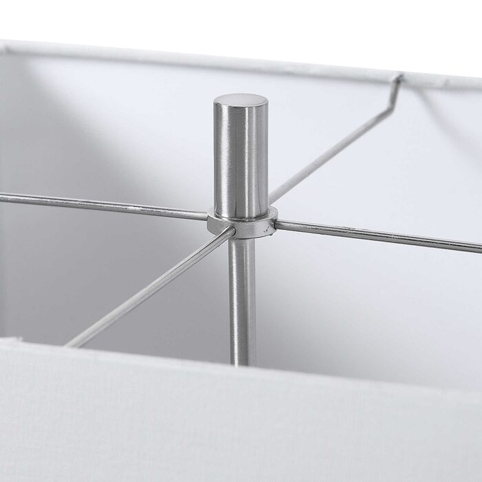 The square hardback shade is a white linen fabric.