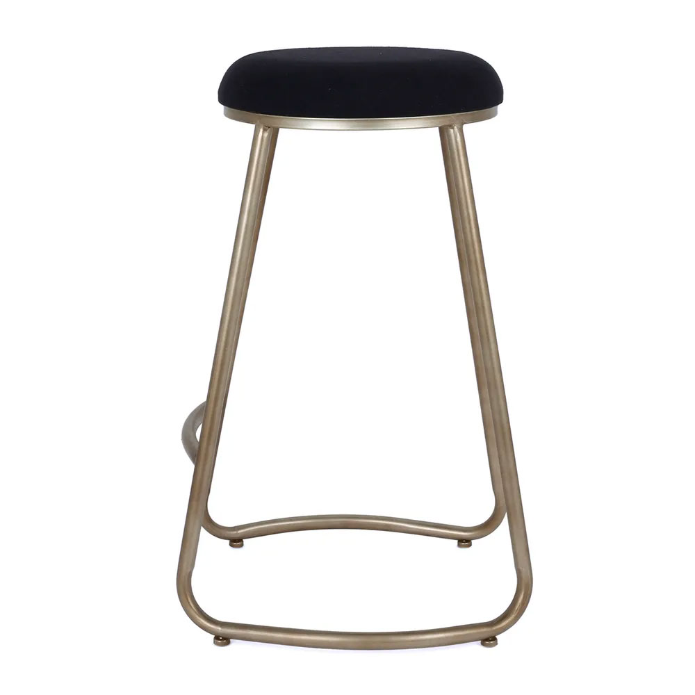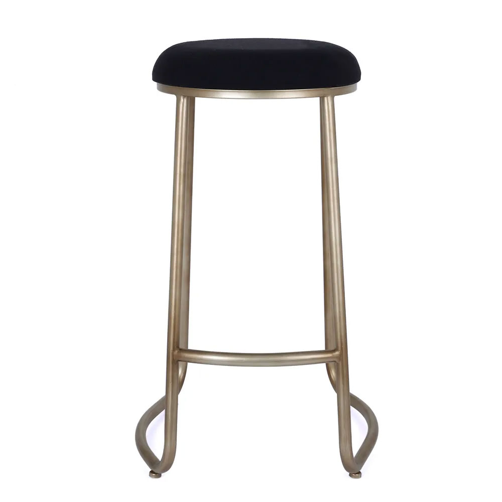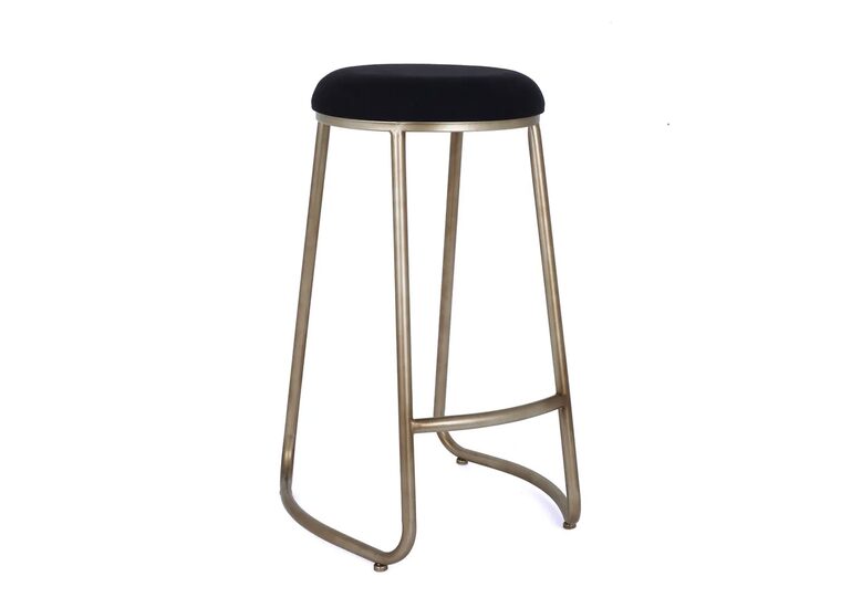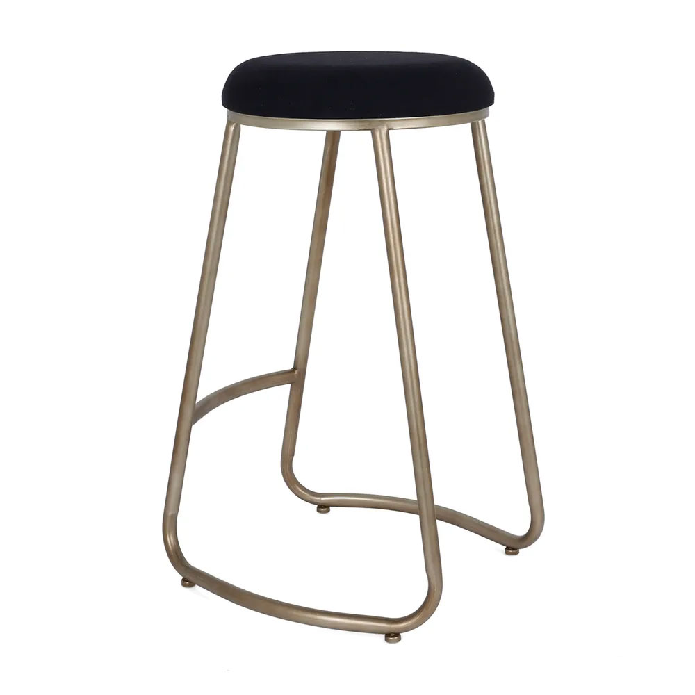 The round, tailored cushion sits atop a gently curved antique gold steel frame, adding refined glamour to contemporary kitchens.