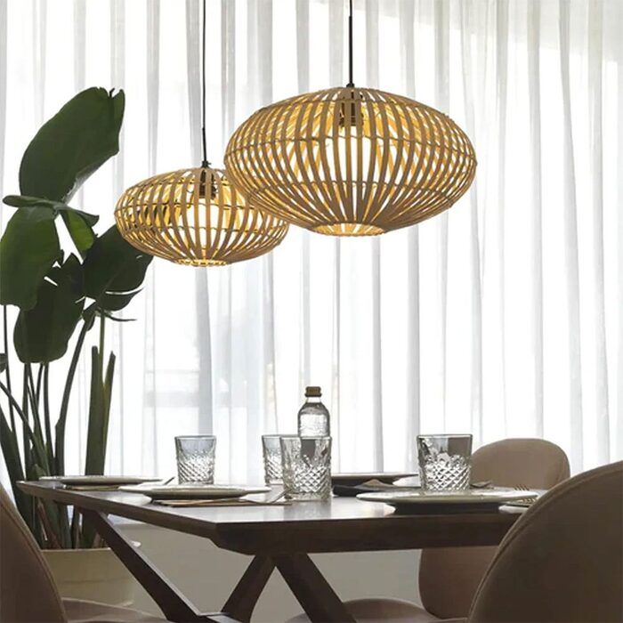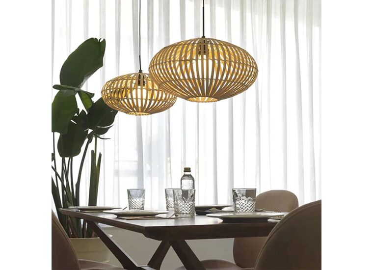 Its lampshade made of natural bamboo slats allows light to pass through, generating a very pleasant atmosphere in the spaces.