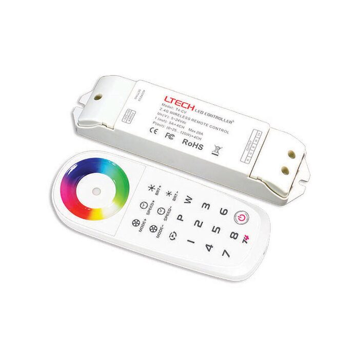 Simple to install & operate 4-channel control system. Featuring RF remote for up to 50M (usually around ~30M) control distance, built in RGB/W effect modes and set colours.