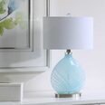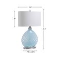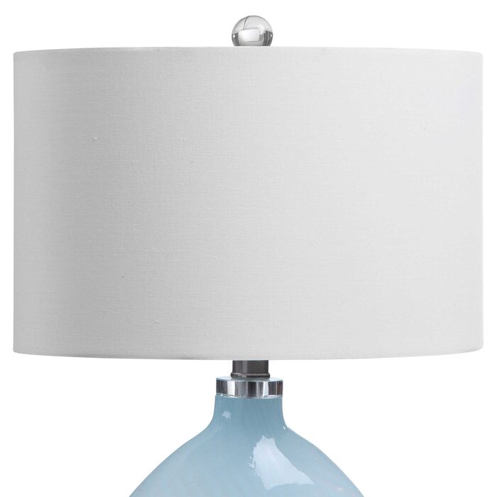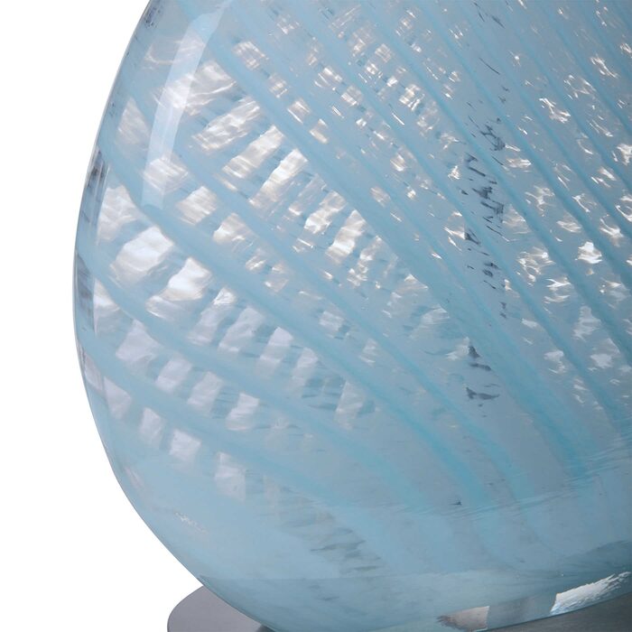 Displaying a coastal color way, this table lamp features an elegant light blue and translucent glass base with wavy details and brushed nickel accents.