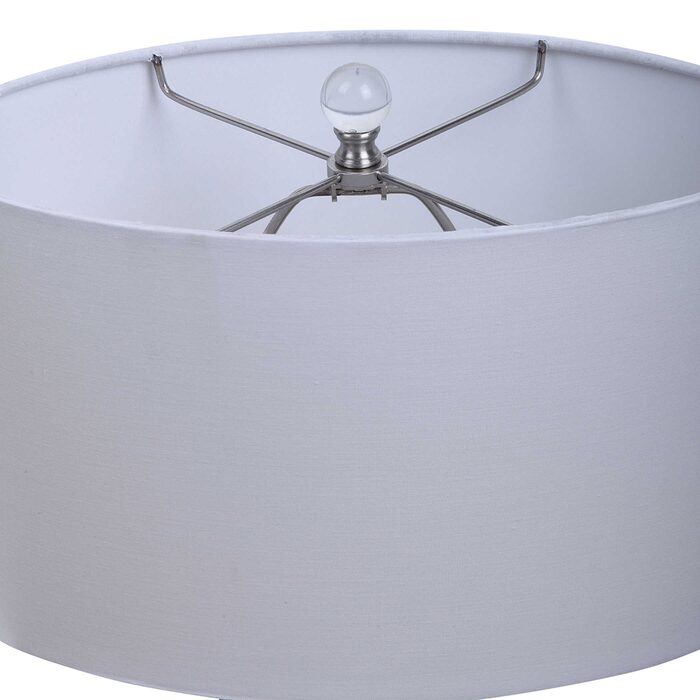 The lamp is paired with an oval hardback shade in an off-white fabric.