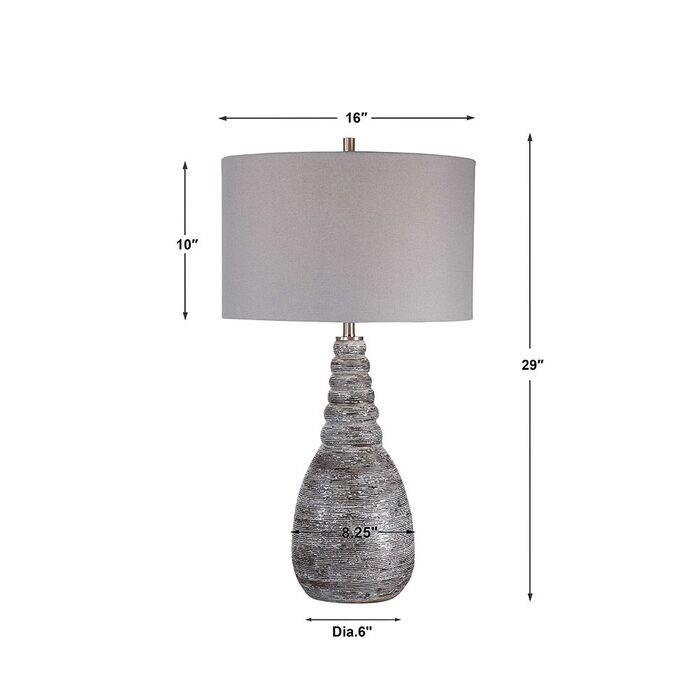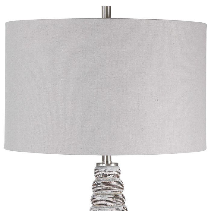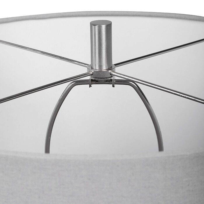 The round hardback drum shade is a light gray linen fabric with natural slubbing.