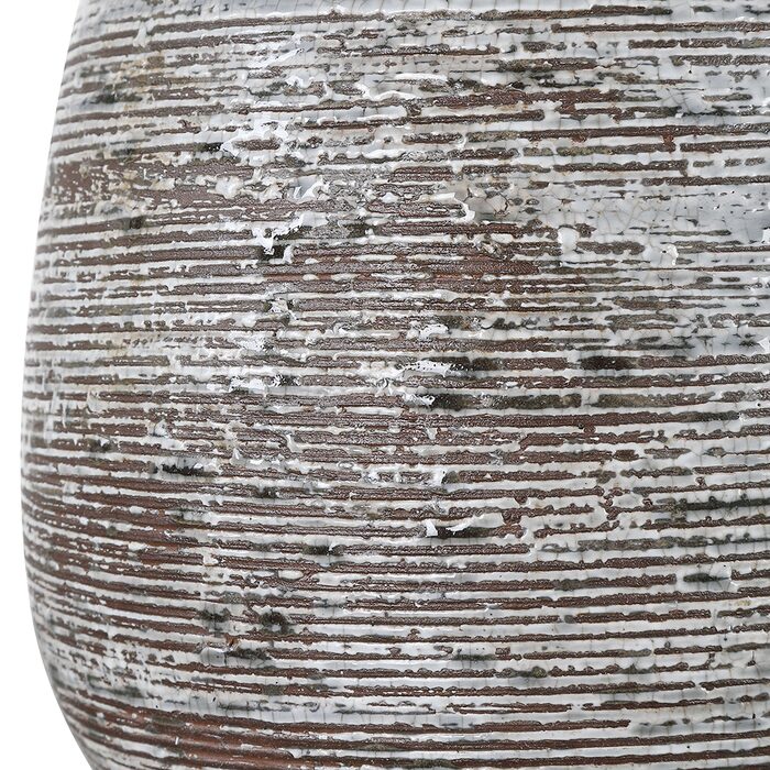 Displaying a unique shape, this ceramic table lamp showcases a noticeable ribbed texture finished in a distressed rust brown and an aged ivory crackle glaze, accented by brushed nickel details.