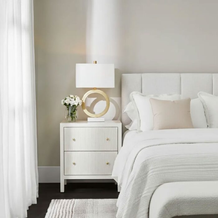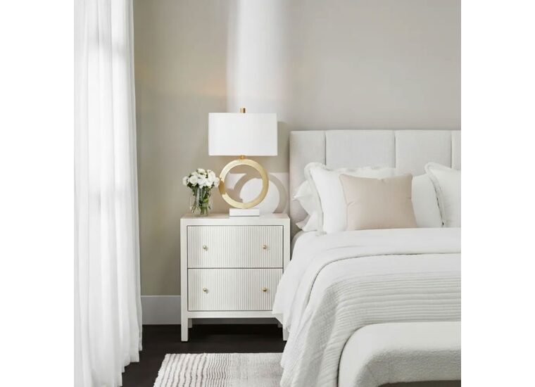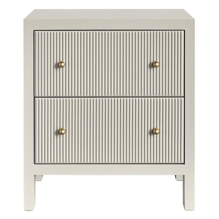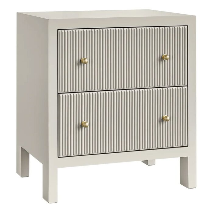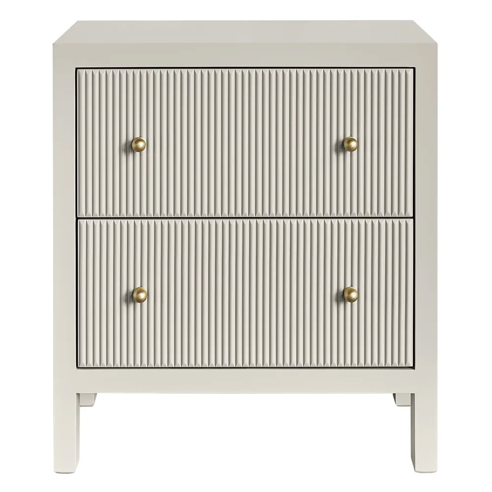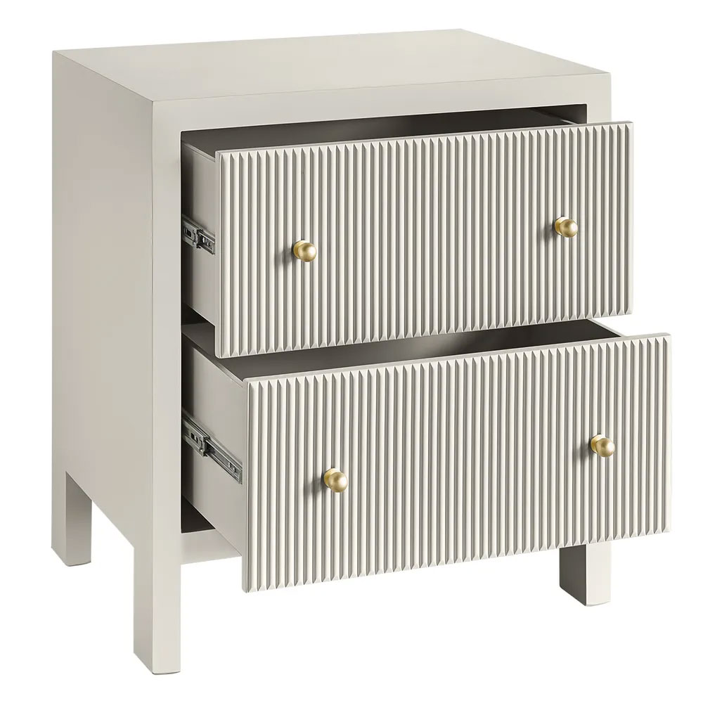 Two generously sized drawers with fluted detailing glide smoothly on metal runners, complemented by a gold knobs for a touch of luxury.