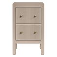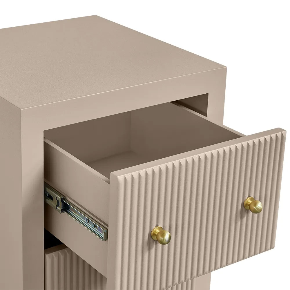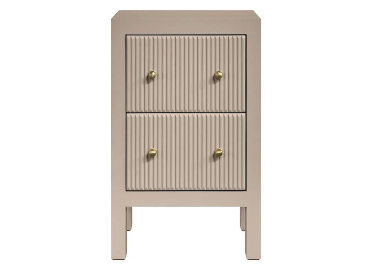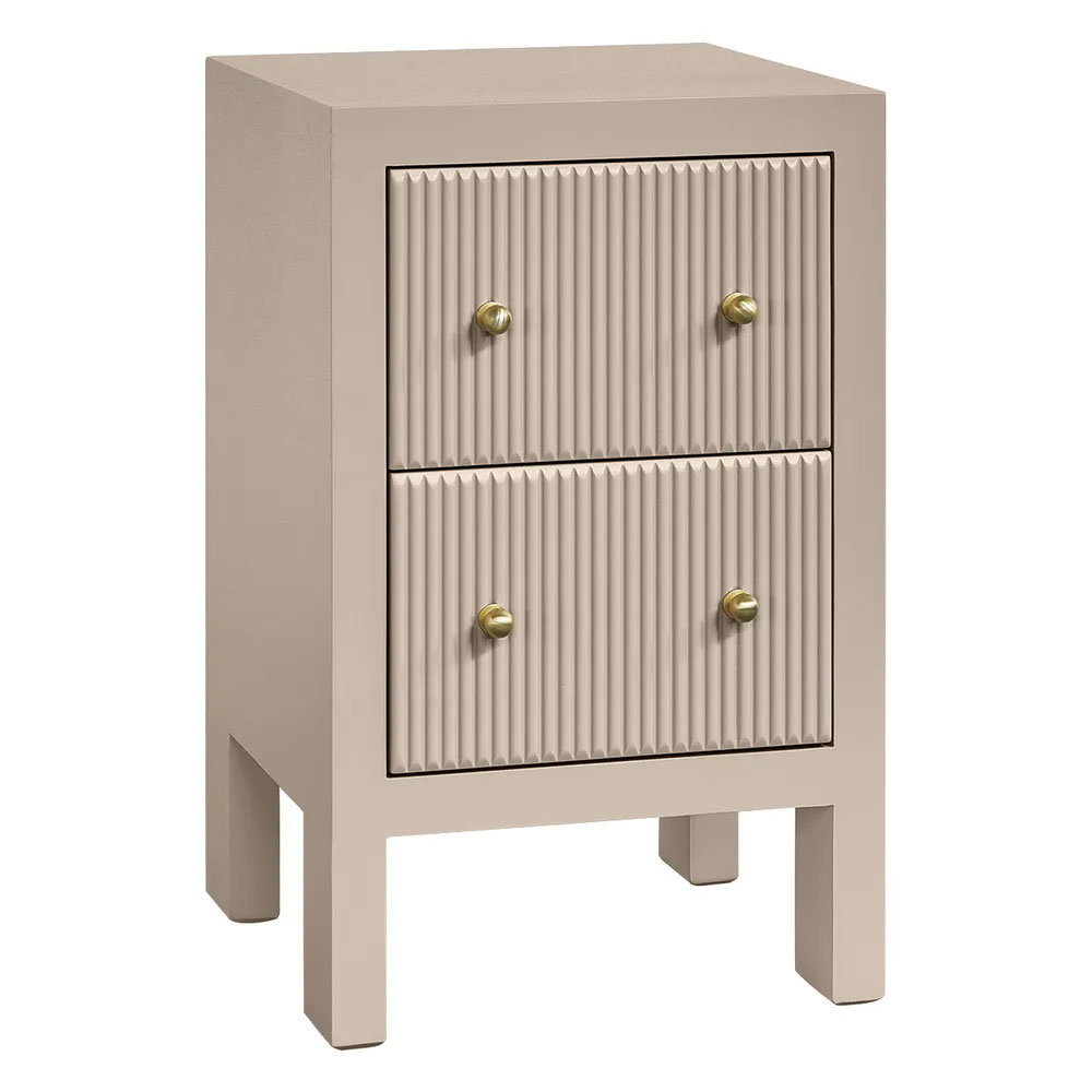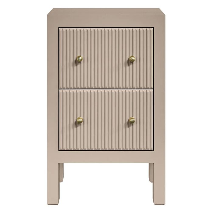 Two drawers with vertical fluted fronts glide smoothly on durable metal runners, complemented by petite gold knobs that add a refined touch of luxury.