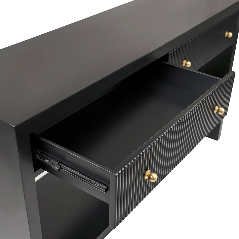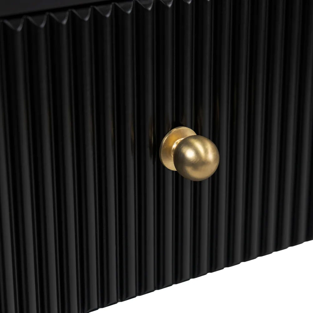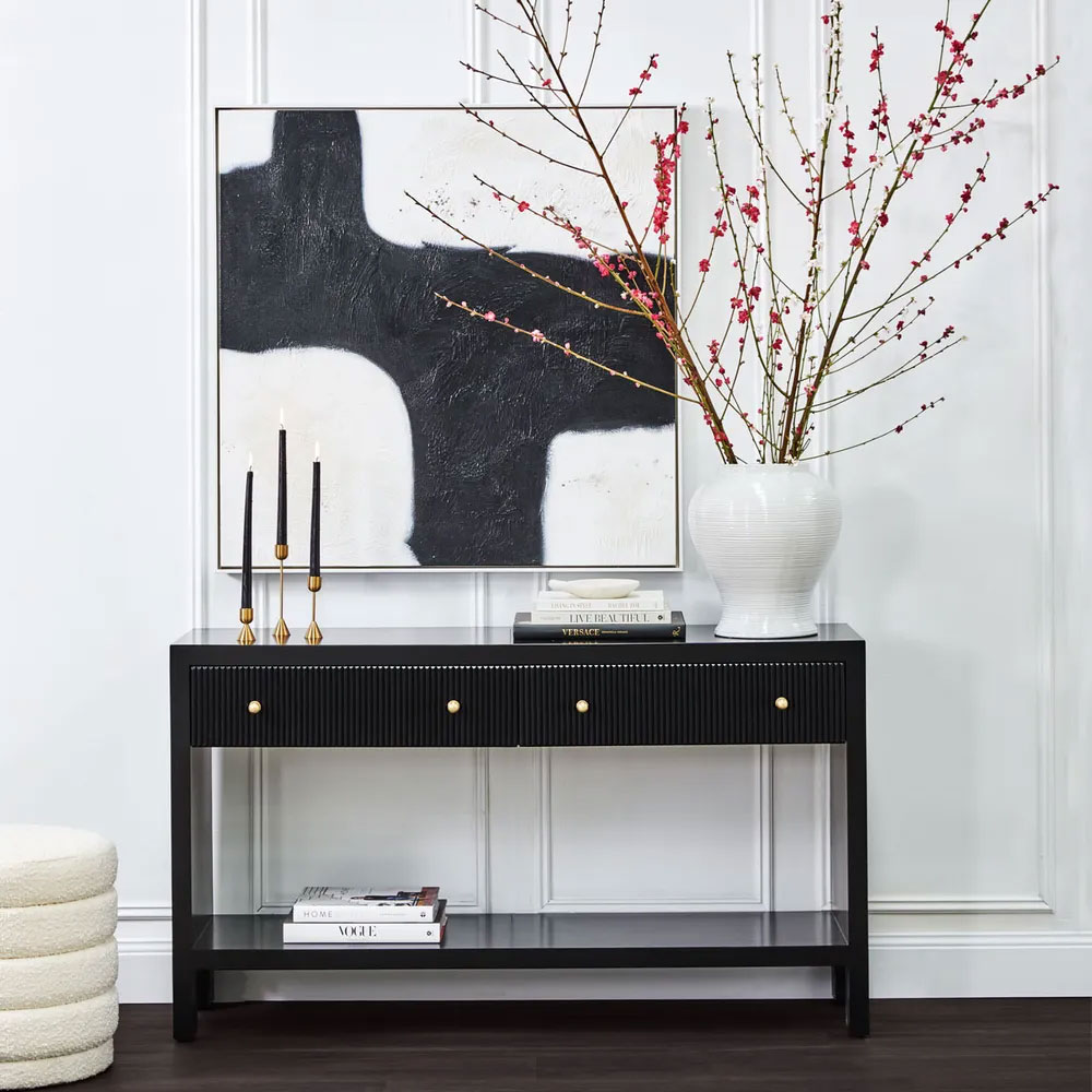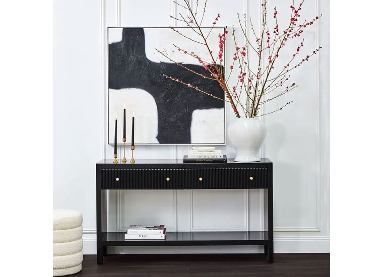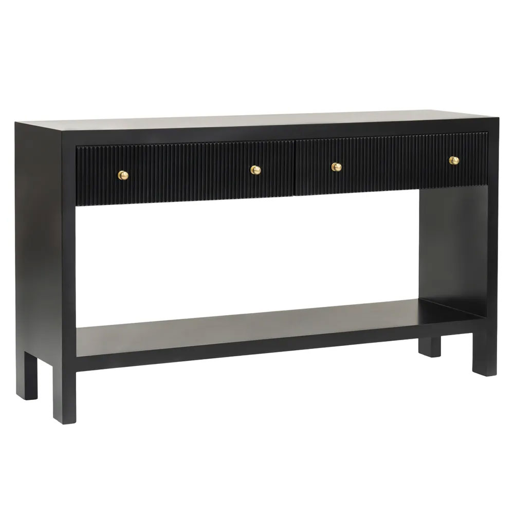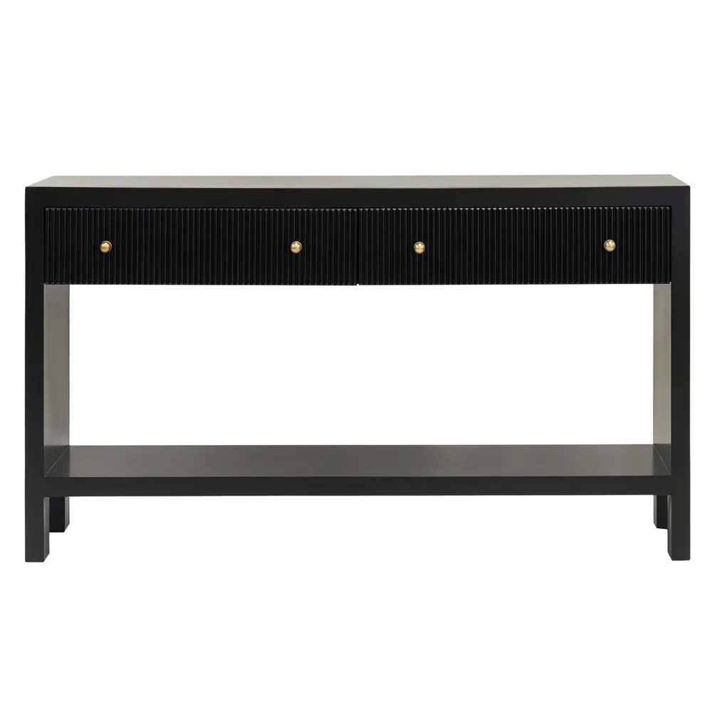 Featuring detailed fluted drawer fronts punctuated by gorgeous brushed gold sphere handles, the Araina console table in black adds an air of uncomplicated luxe to interiors, embracing both function and beauty with two deep drawers and a lower shelf across its handsome proportions.