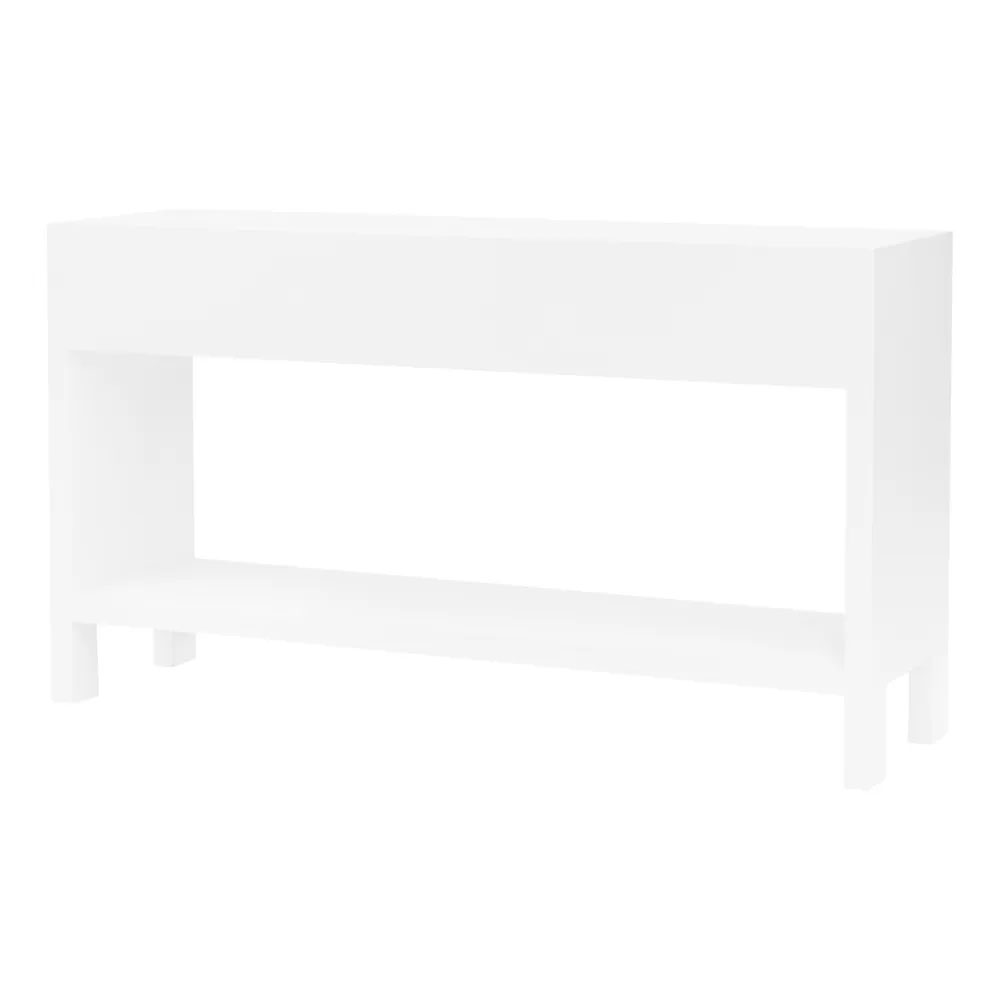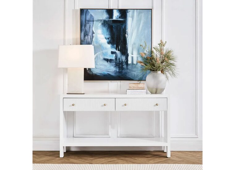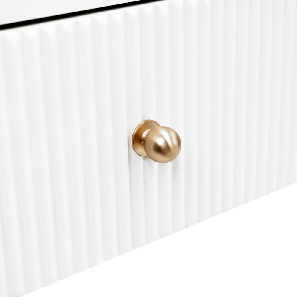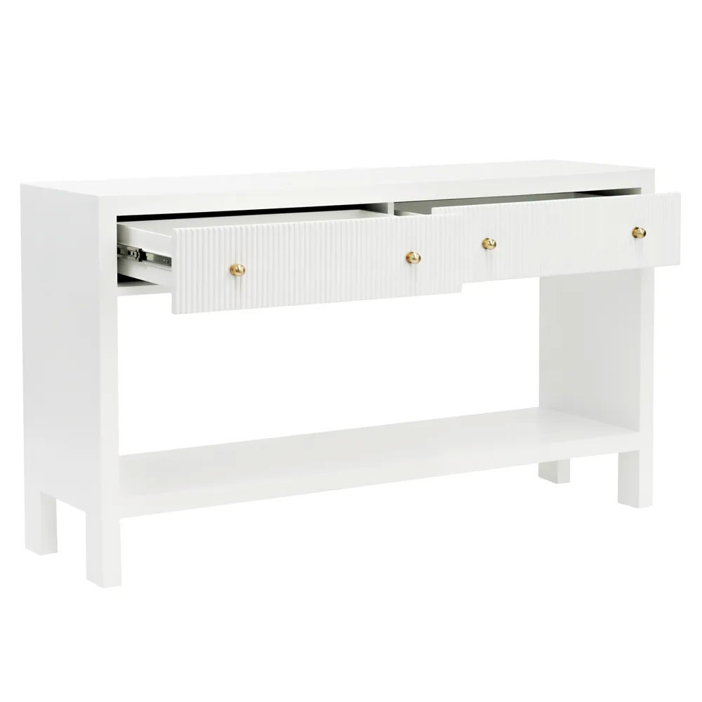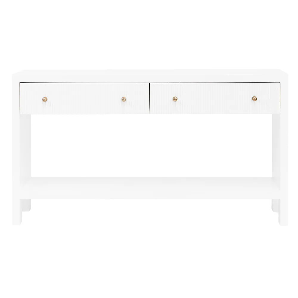 Embracing clean, modern aesthetics, the Ariana console table, in a fresh satin white painted finish, features elegant fluted drawer fronts punctuated by gorgeous brushed gold sphere handles.