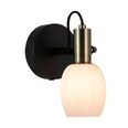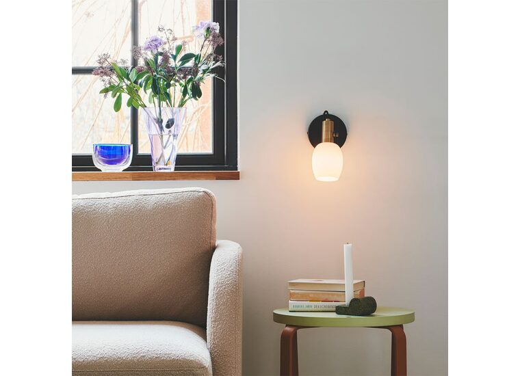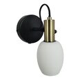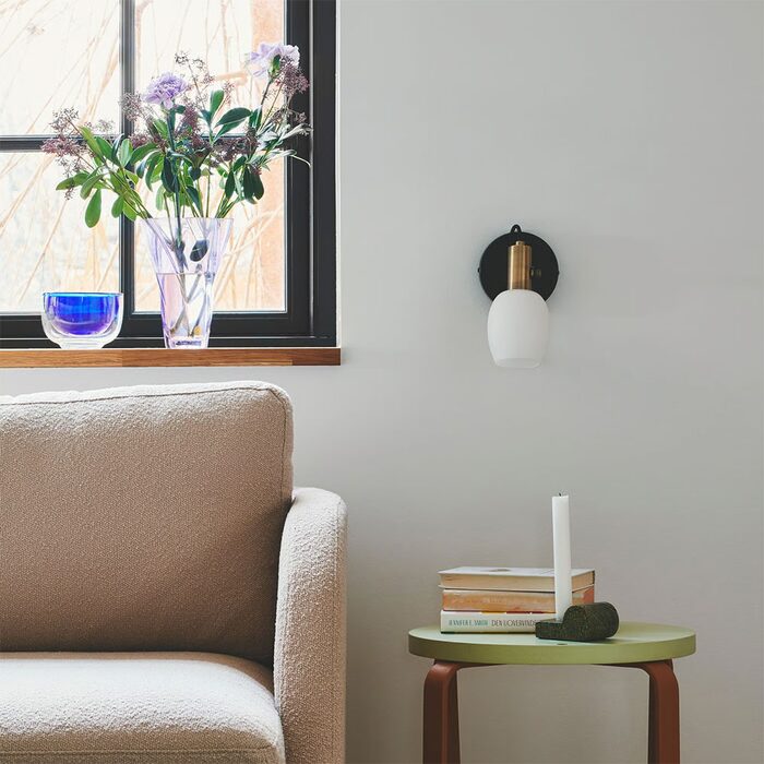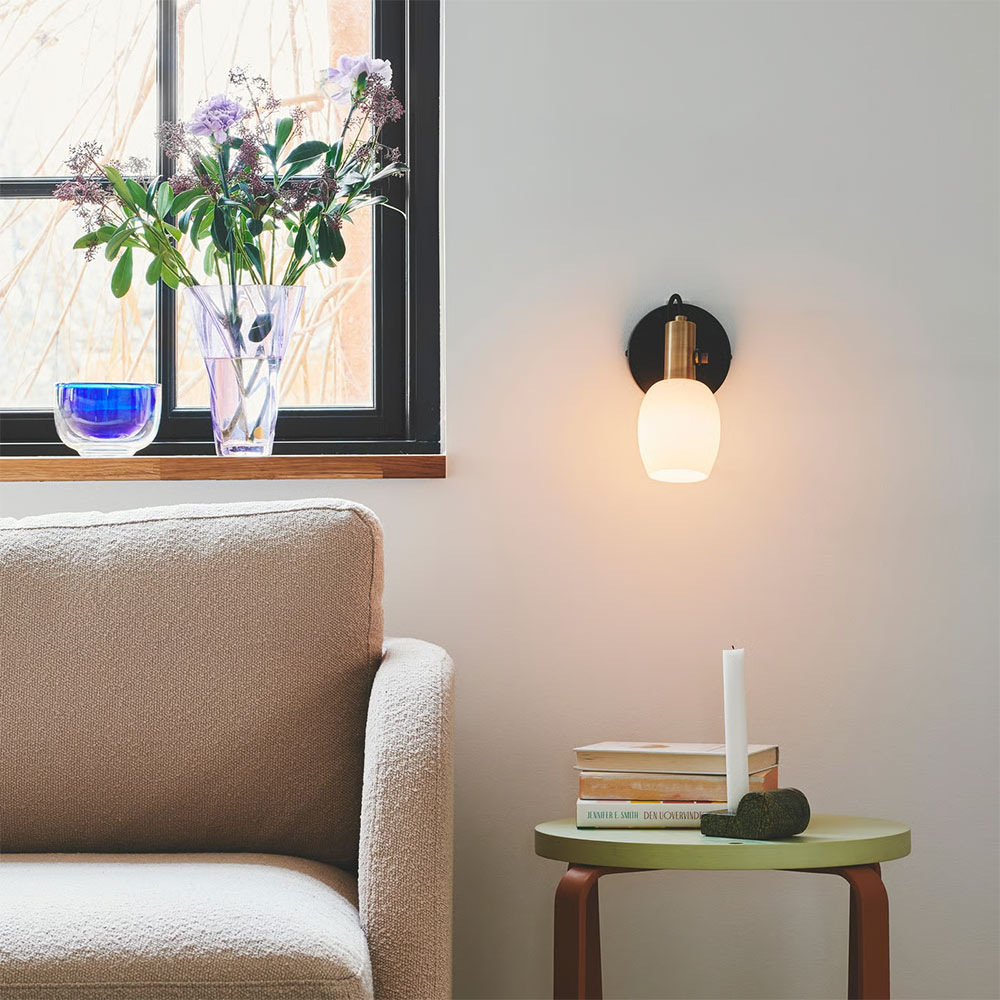 The white, round, matte opal glass shade is elegantly complimented by brownish brass details. You can easily adjust the lamp head for a directional light.
