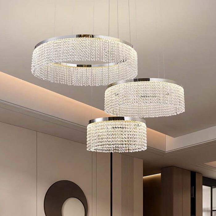 The Armani 3 Tier Crystal Pendant is a stunning blend of classic and contemporary design, featuring elegant K9 crystal droplets that cascade gracefully from a sturdy chrome frame.