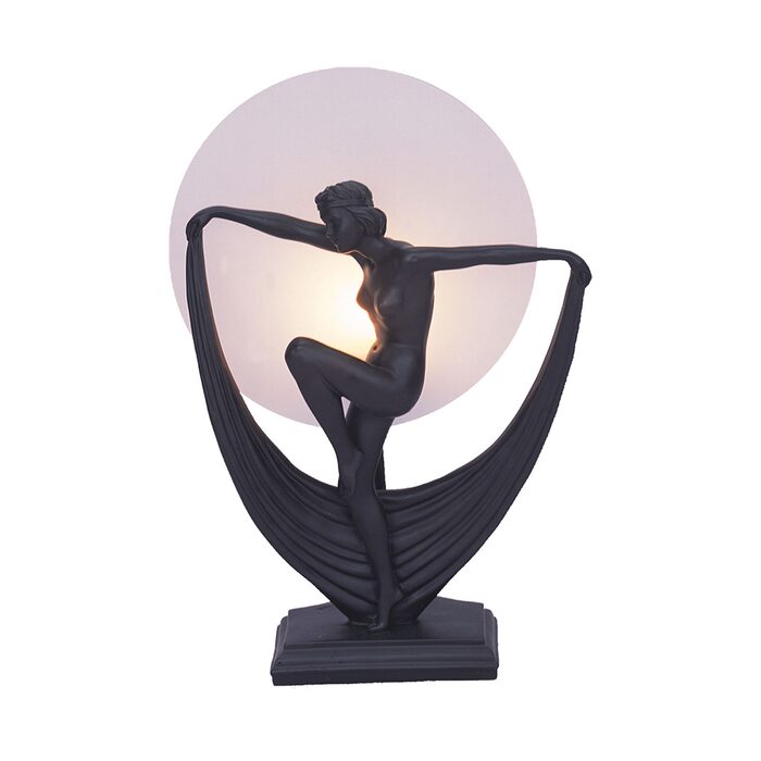 The design features a comtemporary dancing lady that is supported by a frosted round glass panel light.