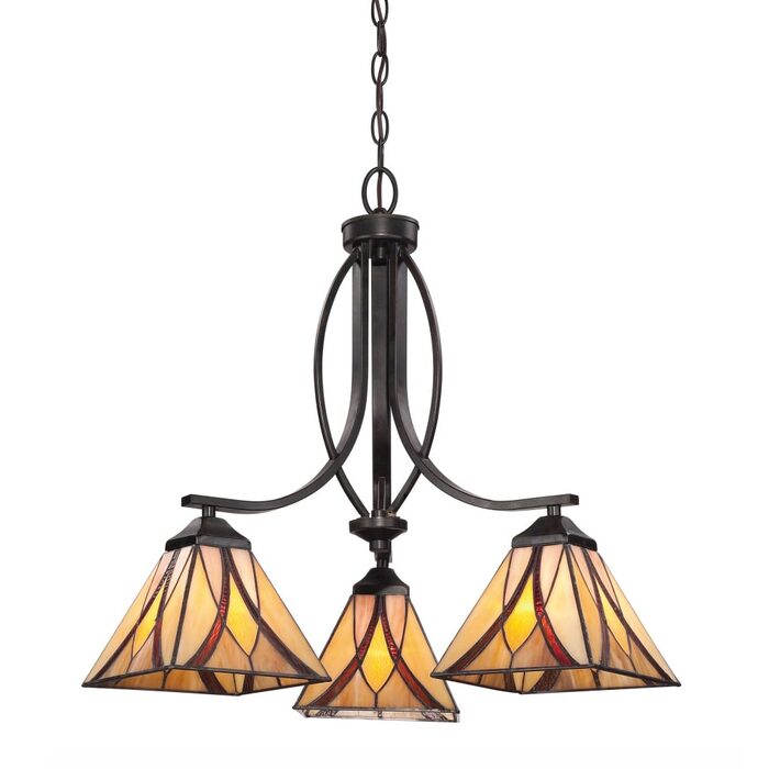 The Valiant Bronze finish anchors the traditional styling. The art glass that the shades are comprised are handassembled using the copper foil method developed by Louis Comfort Tiffany.