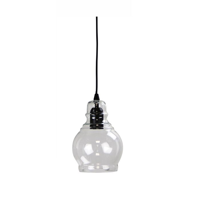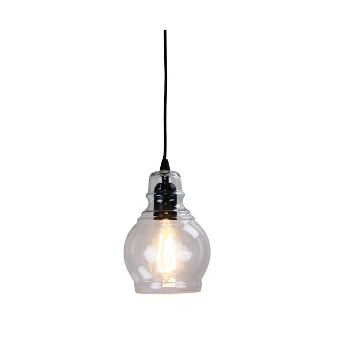 AUBURN clear handblown glass single pendant. Supplied with a black 1.8m suspension and E27 lamp holder. Ideal for clustering, over meals or stairwells.