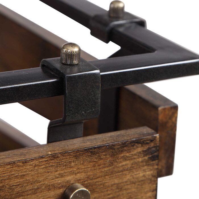 This is enhanced with Antique Brass accents and a dark bronze metal finish.