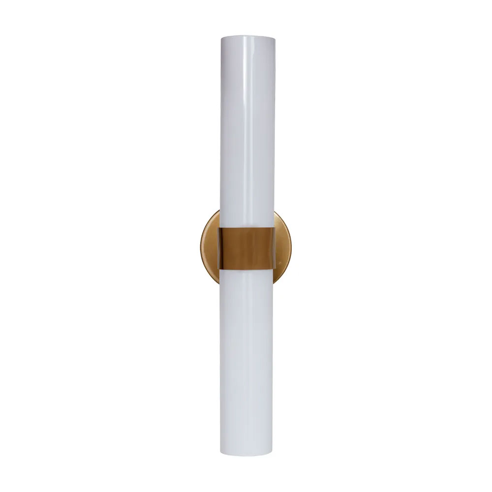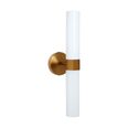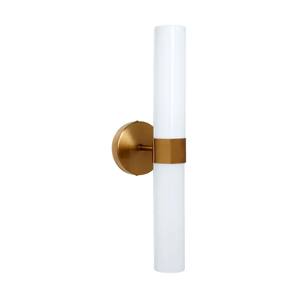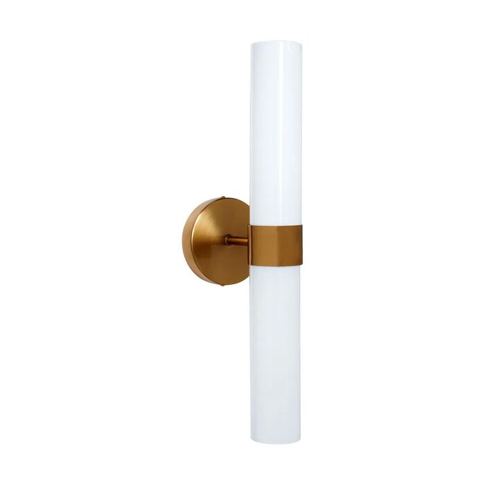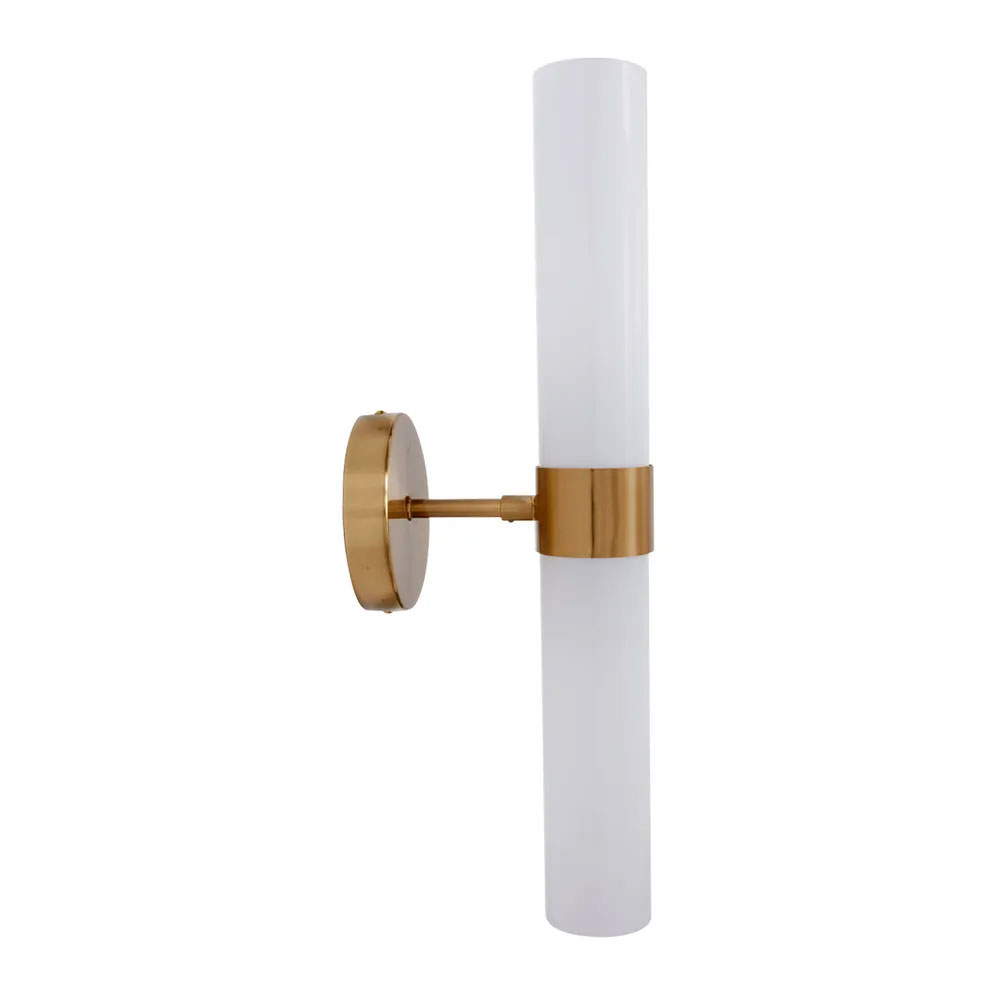 Add a touch of elegance to your interiors with this sleek wall sconce, featuring a brushed gold base and a cylindrical opal shade.